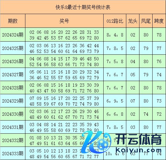 抖擞8第2024333期奖号为:0305101213182327303348495456606567717277,其中奖号012路比为10:4:6世界买球网体育信息,跨度为74。 抖擞8第2024334期号码分析 一、龙头凤尾分析 龙头分析:上期龙头为0路奖号03,在近10期开奖中,0路龙头出现2次,1路龙头出现3次,2路龙头出现5次,2路龙头走势活跃,现在2路龙头轮空了3期,本期防2路龙头回补,参考龙头02。 凤尾分析:上期凤尾为2路奖号77,在近10期开奖中,0路凤尾出现0次,1路凤尾出现