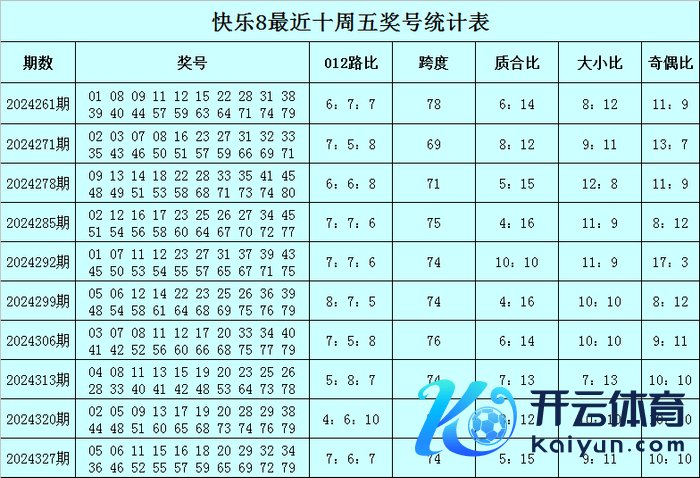 福彩茂盛8第2024327期(上周五)开奖追想:05 06 11 15 16 18 20 29 32 34 36 46 52 55 57 59 65 69 72 79,其中奖号012路比为7:6:7,跨度为74,质合比为5:15,大小比为9:11,奇偶比为10:10。