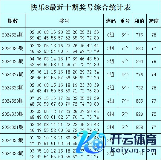 福彩欢喜8第2024333期开出奖号:03 05 10 12 13 18 23 27 30 33 48 49 54 56 60 65 67 71 72 77,其中奖号和值为793,跨度为74,包含5个重号10、13、30、49、65,包含连码12 13、48 49、71 72。
