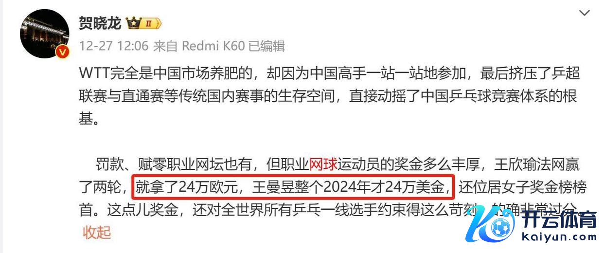 凭证记者贺骁龙的分析,中国乒乓球选手王玉曼这一年唯有戋戋24万好意思元的奖金,而一些顶级网球选手打个比赛奖金皆能是四位数以致五位数。