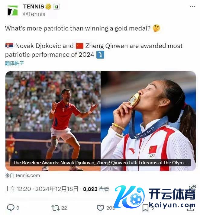 聚焦网坛赛事,顺心中国金花。 2024赛季的做事网坛基本搁置,现在大大量球员齐在放假或者参预冬训当中。 来到年底,各式奖项评比层见错出。 12月18日,一则关联中国金花的好音信传来: 天下着名网球媒体TENNIS评比了本赛季“最爱国发达奖”(most patriotic performance of 2024),中国金花一姐郑钦文和塞尔维亚天王德约科维奇一齐,凭借着在巴黎奥运会上夺金的发达,见效获此盛誉。 本年是奥运年,因此“最爱国发达奖”从代表本国参加巴黎奥运会并拿到好收获的通顺员中选出,无